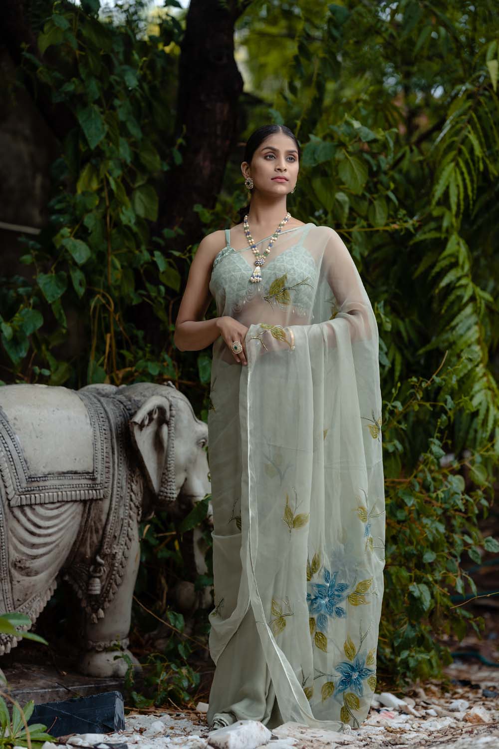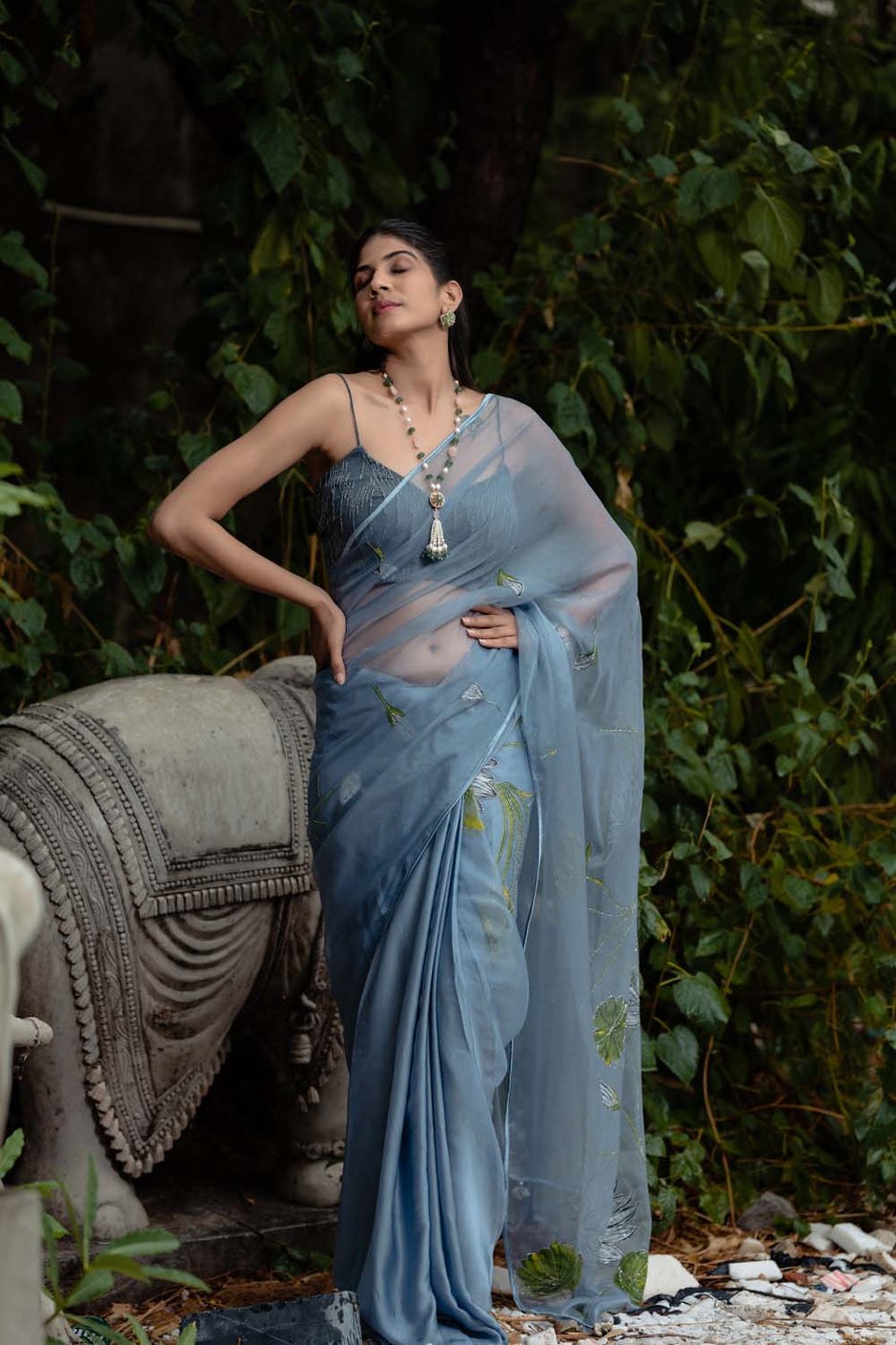 Tulip Saree - Organza Blue, Gray Saree With Blouse