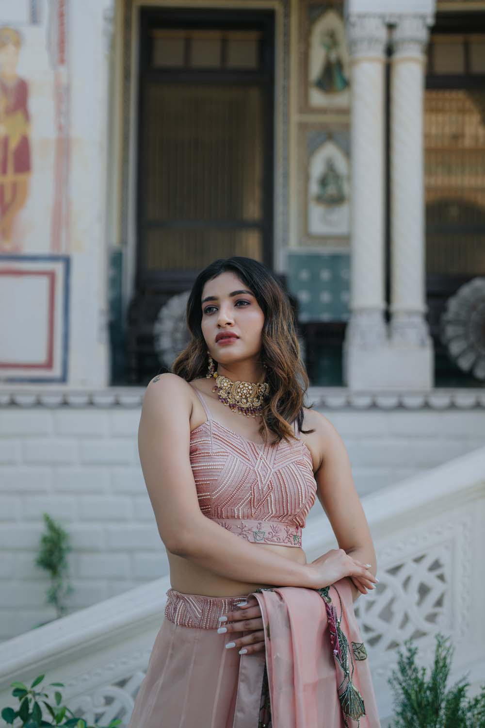 Indrivar - Rose Gold Lehenga Blouse & Dupatta Set